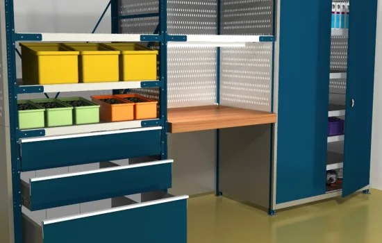 Стеллажный комплекс с рабочим местом для хранения и обработки деталей и инструментов. В стеллаж складской среднегрузовой добавлены верстаки, столы, шкафы и двери.