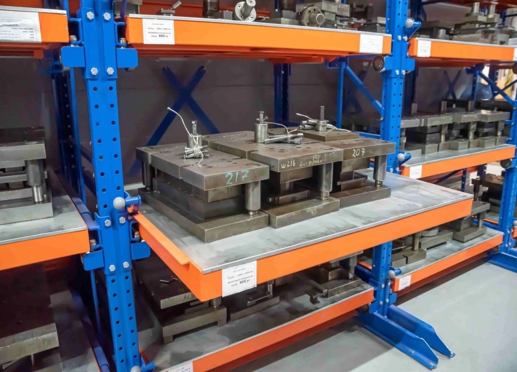 Стеллажи для хранения тяжелой оснастки, штампов и форм для литья с нагрузкой до 1400 кг. Встроенный механизм защиты от одновременного выдвижения уровней. Фиксация полок в выдвинутом и задвинутом состоянии.