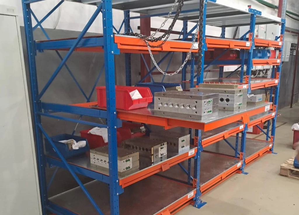 Стеллажи с полками частичного выдвижения для хранения промышленной оснастки, вырубных штампов, фланцев, инструмента и других предметов. Механизм защиты от одновременного выдвижения.
