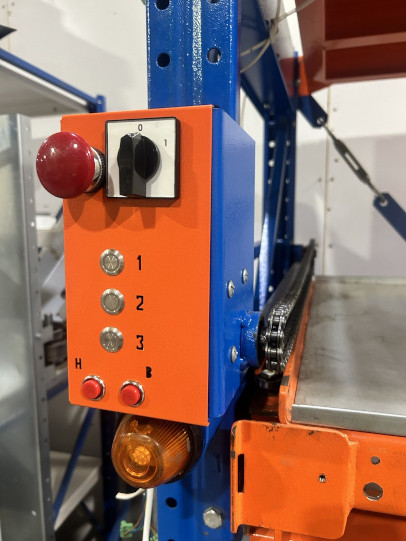 Управление осуществляется через силовой блок с панелью управления, оснащенный 2-5 кнопками. Вертикальный ряд кнопок отвечает за выбор полок, при этом их расположение на панели соответствует расположению полок на стеллаже для удобства использования. Две нижние кнопки (красная и зеленая) предназначены для управления направлением движения выбранной полки, что делает систему максимально интуитивно понятной для пользователя.